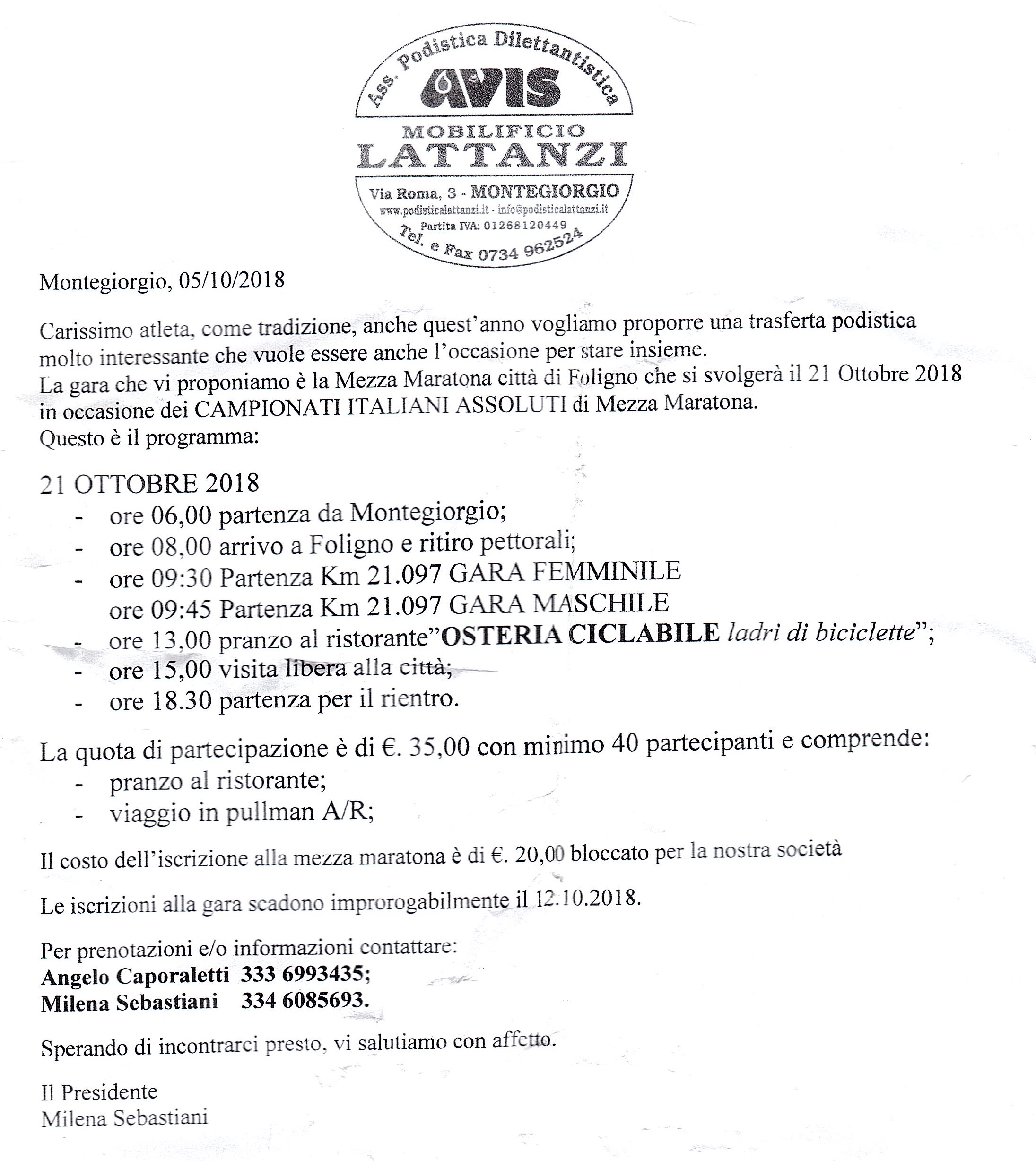 Il Gruppo podistico AVIS Mobilificio Lattanzi di Montegiorgio propone una trasferta per la Mezza Maratona di Foligno, il 21 ottobre prossimo, in occasione dei campionati italiani assoluti.